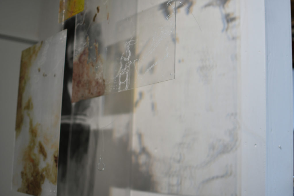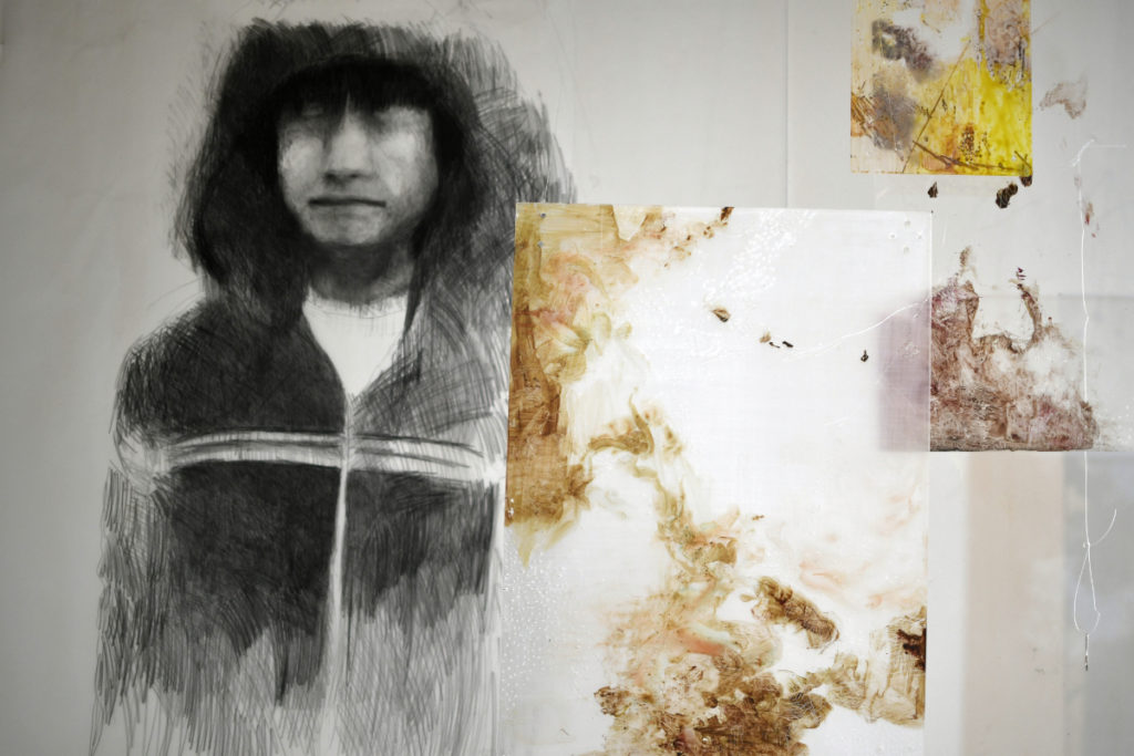 鉛筆で描かれた11歳の私の前に、コロナ下で使用していたアクリル板を吊り下げる。