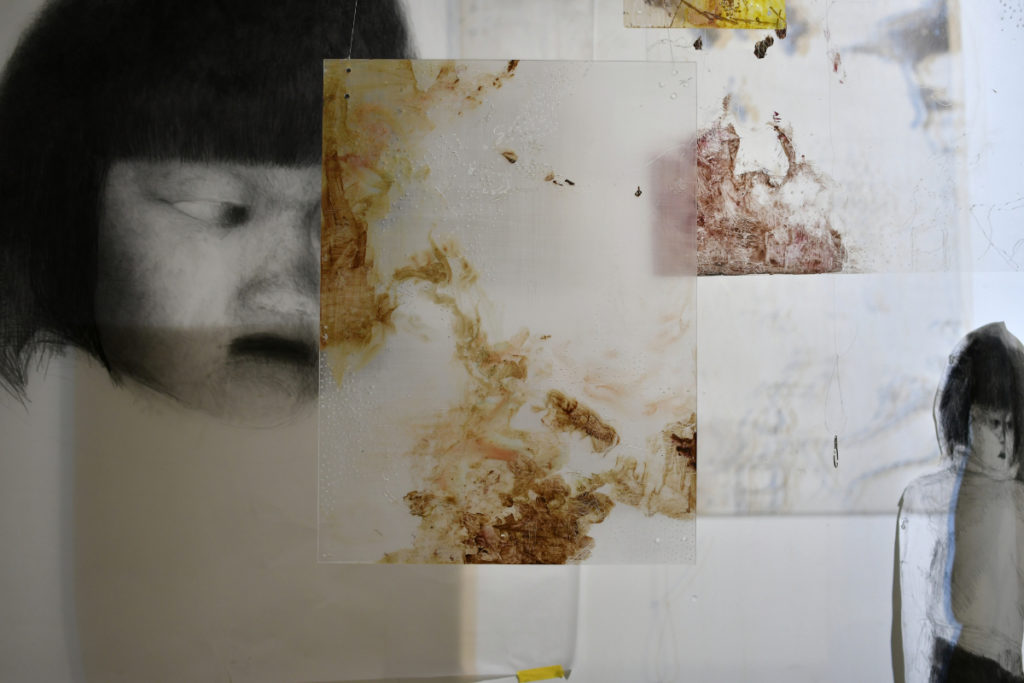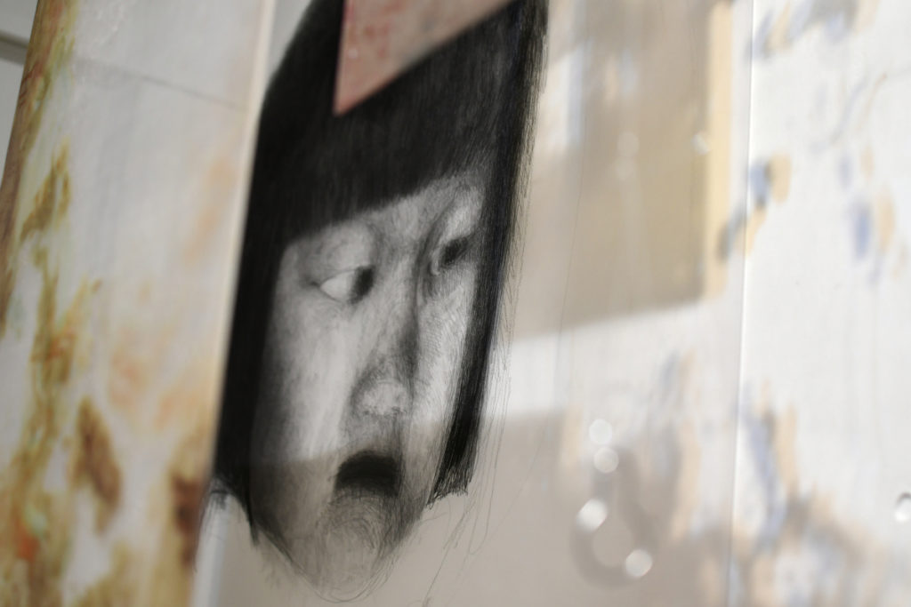 本作は、鉛筆で描かれた9歳の私の前に、コロナ下で使用していたアクリル板を吊り下げている。アクリル板は、時間という見えない境界を示している。