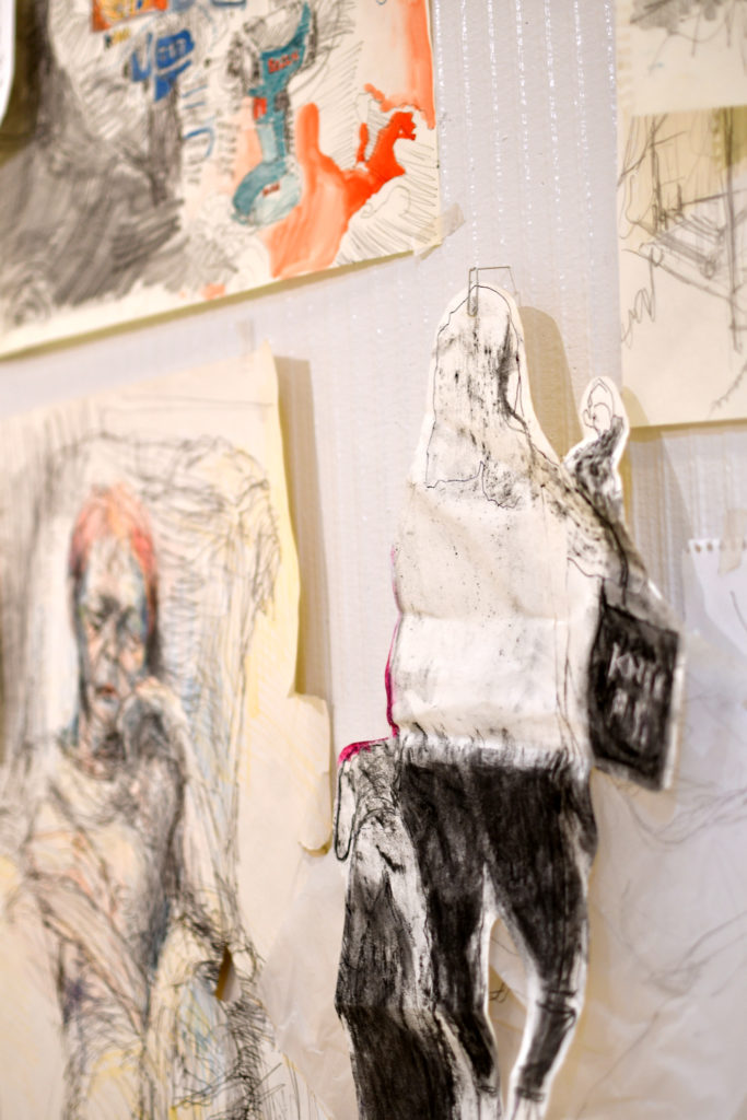 ドローイングと風で揺らぐアクリル板の影が、静と動、過去と現在の対比を生み出す。