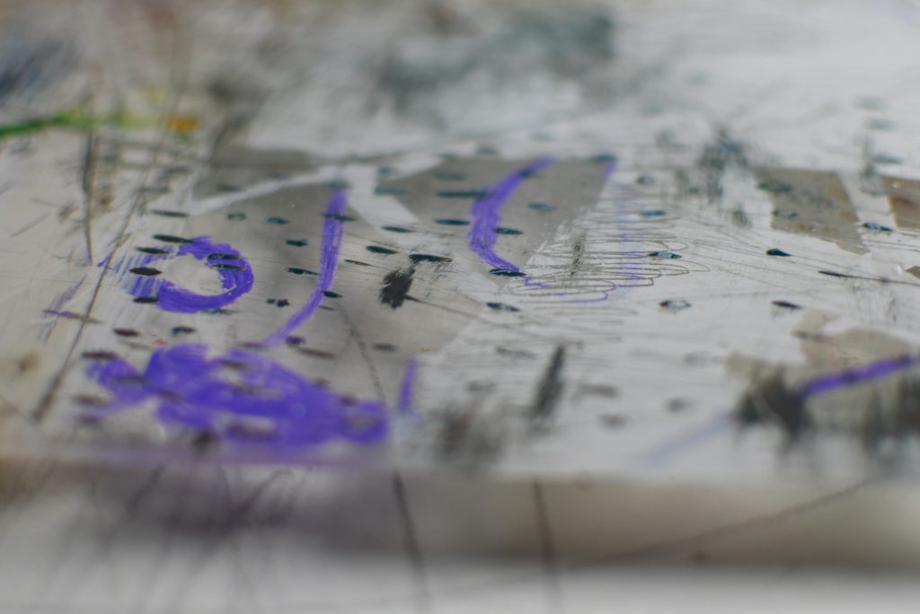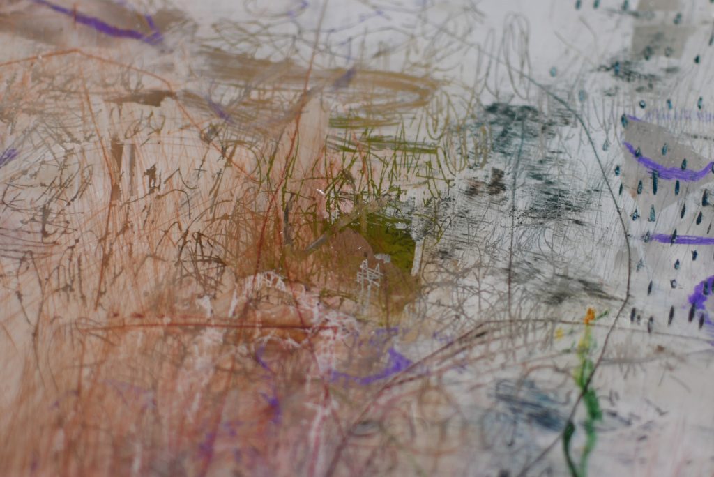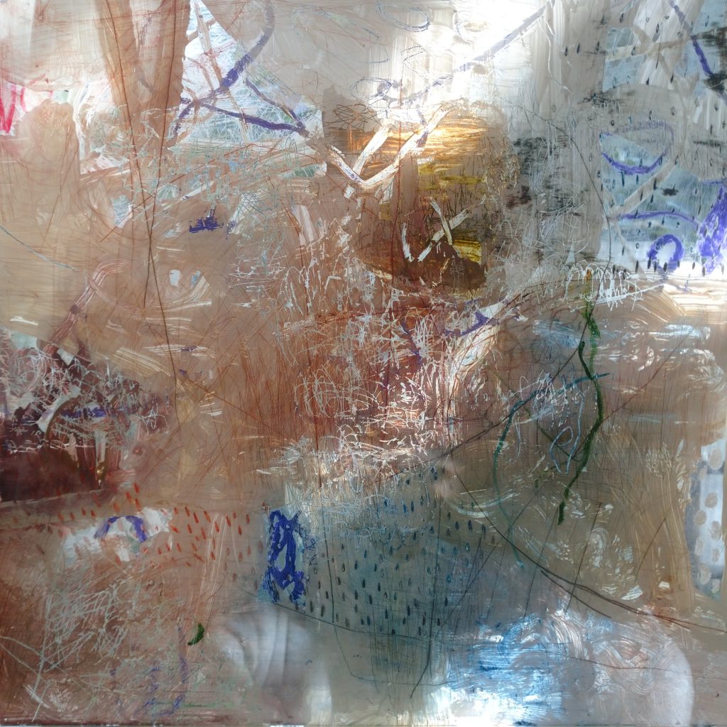 北海道・道東を旅した際の風景の記憶をもとに制作した作品です。透過する光や重なり合う色で、広大な自然と空気感を表現しています。本作は、アクリル板に描く手法に初めて挑戦した作品であり、自身の表現における転機となりました。後の《浜辺のケチャップ瓶》にもつながる、重要な一作です。