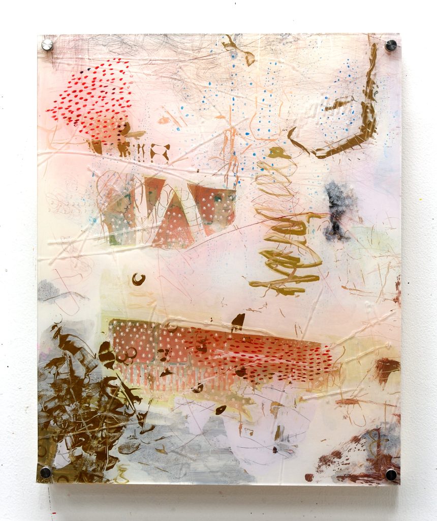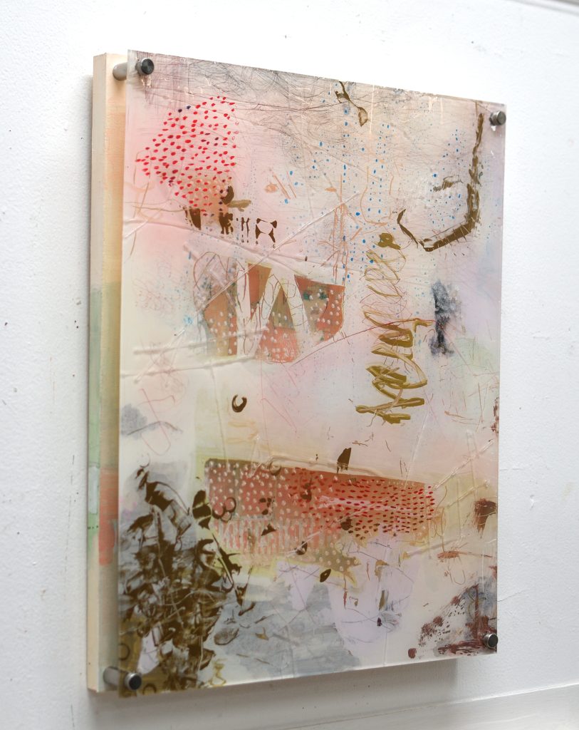 この作品は、高校時代の曖昧な記憶をもとに制作した二層構造の作品です。1層目では、校舎の風景を抽象的かつぼんやりと描き、当時の自分が感じていた世界の不確かさを表現しています。一方で、窓越しに見える生徒たちは輪郭をはっきりと描き、人間関係への意識の強さを示しています。記憶と知覚、自己と環境の微妙な関係性を探る試みです。